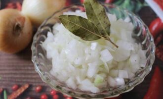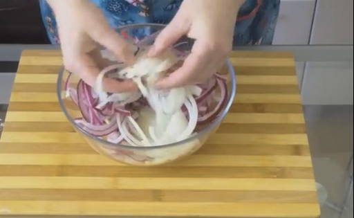 - Breng de ui over in een kom naar de marinade, roer en laat een half uur staan.