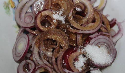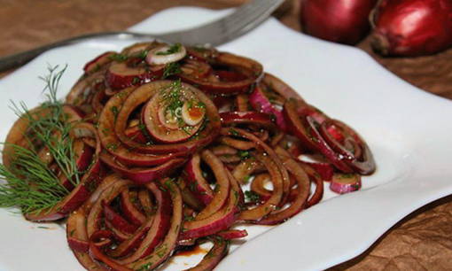 Nog een interessant recept voor het inmaken van uien. Het kan worden geserveerd met lichtgezouten haring, vlees en worden toegevoegd aan verschillende hapjes en salades. Of wikkel de ingelegde uien gewoon in pitabroodje, ook dit is een erg lekker voorgerecht.