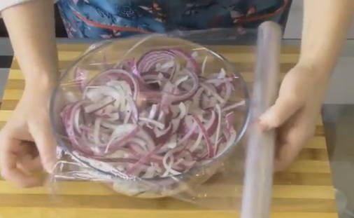 - Giet de marinade over de ui, roer, draai de kom vast met huishoudfolie en laat 40-60 minuten marineren.