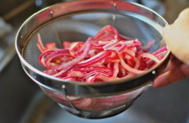 - Dek de kom af en laat de uien ongeveer 1 uur marineren. Doe de uien vervolgens in een vergiet en laat de vloeistof weglopen.