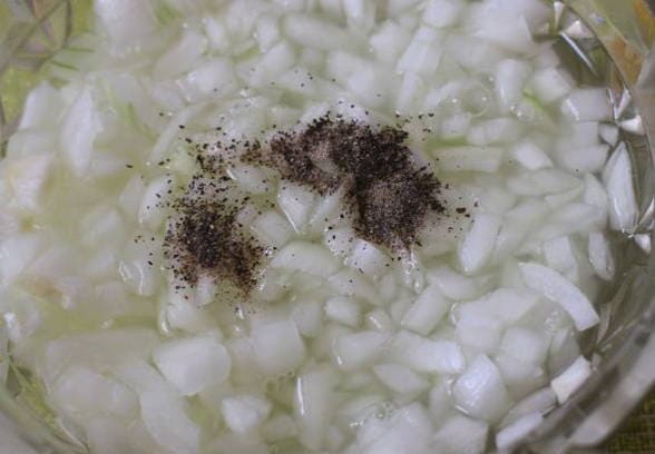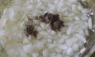 - Doe de ui in een kom, voeg zout en gemalen peper toe, meng.