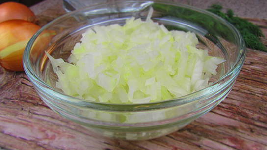 - Was de dille, hak fijn met een mes en voeg toe aan de ui. Roer de inhoud van de kom door en laat 20 minuten marineren.