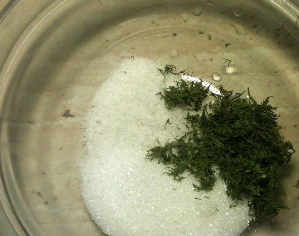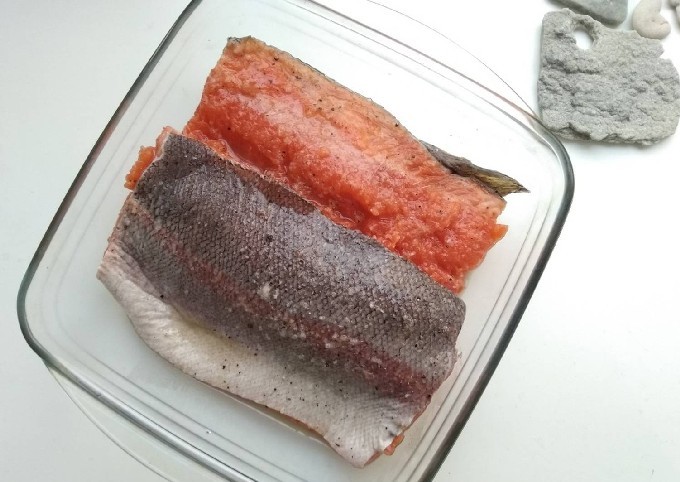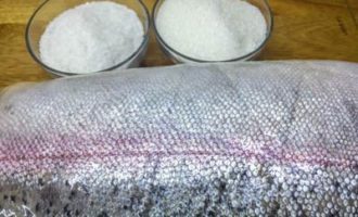 - We leggen de forel in lagen in een plastic bak. Elke laag moet worden ingevet met zout en suiker en besprenkeld met olie.