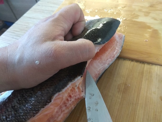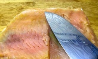 We halen, verwijderen de extra laag zout van de vis en snijden de filet in verschillende reepjes.