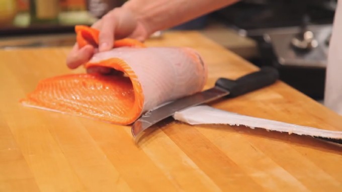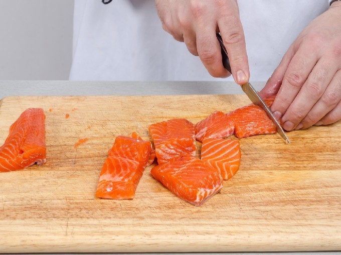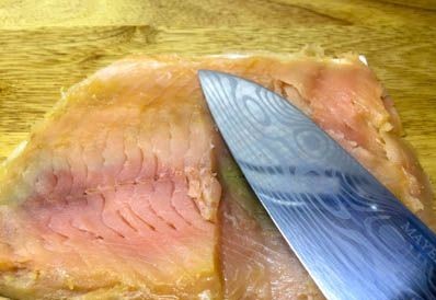 - Nu moet je de forel in verschillende plakjes snijden.