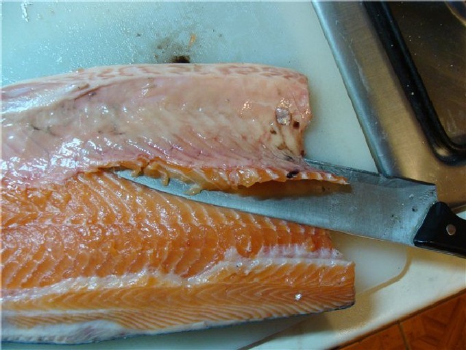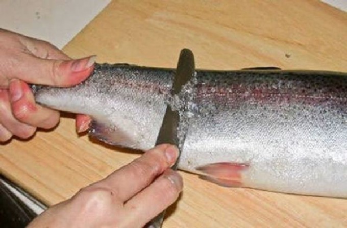 - Forelfilet bereiden. Om dit te doen, verwijdert u de botten van de vis, snijdt u de kop en de vinnen af en maakt u ze schoon.