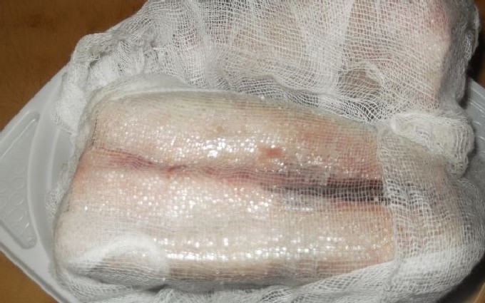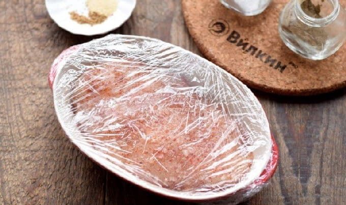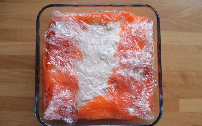 - We wikkelen het formulier in huishoudfolie zodat er geen lucht in de vis komt, je kunt het afdekken met een losse handdoek. En zet het 12 uur in de kou.