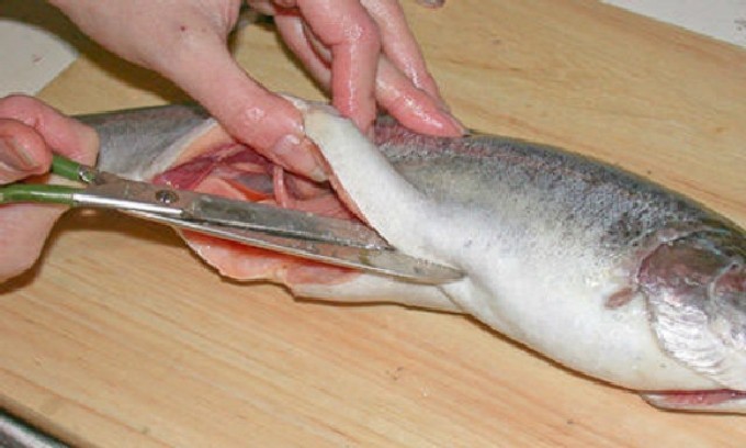 - De forel moet worden voorbereid. Om dit te doen, wassen we het, snijden het hoofd af met een scherp mes, snijden de buik en halen de binnenkant eruit. Verdeel de forel in twee helften, haal de botten eruit.