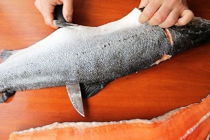 - Laten we de producten voorbereiden. Forel moet worden geschild, wervels, botten worden verwijderd, kop en vinnen worden verwijderd. We snijden de vis in 2 delen.
