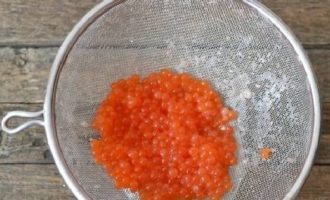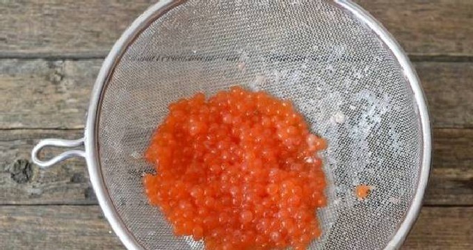 Spoel de kaviaar door een zeef met lauwwarm gezouten water.