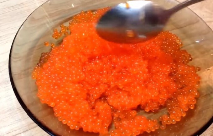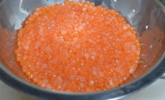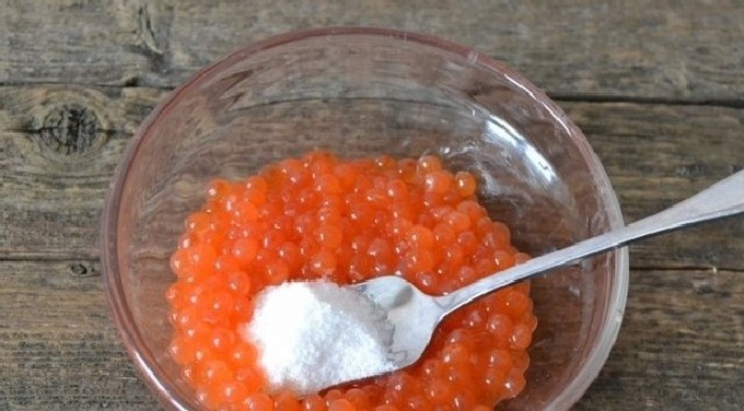 Roer voorzichtig met zout en suiker, die dik met kaviaar moeten worden bestrooid, zodat de eieren niet worden beschadigd. Week de kaviaar 10 minuten.