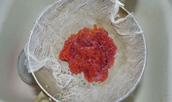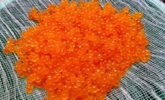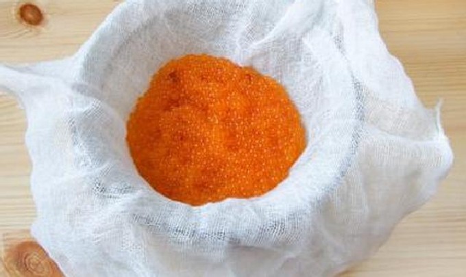 - Zeef op kaasdoek of vang kaviaar uit de pekel met een fijne zeef. Laat het water volledig weglopen en droog de kaviaar gedurende 10-15 minuten.