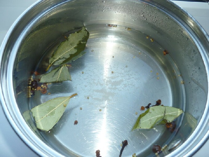 - Voeg kruiden, zout en suiker toe aan het water, breng het aan de kook en laat het niet langer dan drie minuten sudderen. Bedek de pot met een deksel om de pekel af te koelen. Als je meer kaviaar hebt dan aangegeven in het recept, dan moet je meer water en kruiden nemen om meer pekel te maken.