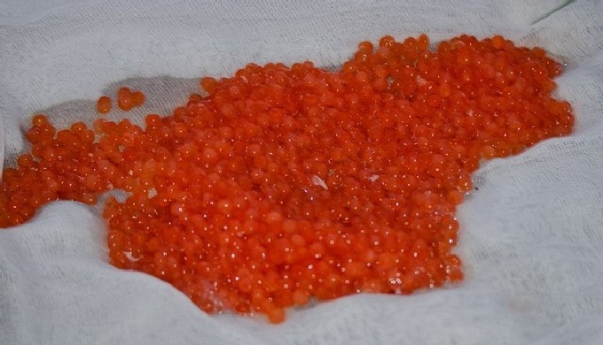 - Was kaviaar in eierstokken snel en laat het een beetje drogen.