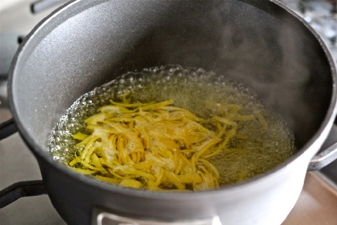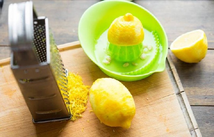 - Verwijder de schil van een citroen met een rasp (je kunt de schil heel dun snijden met een mes), en pers het sap in een andere kom en zeef.