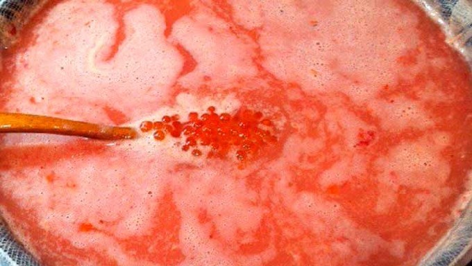 - De pekel (zout en suiker) moet 3 minuten worden gekookt als je de kaviaar enige tijd in de koelkast wilt bewaren. Als je van plan bent om de volgende dag alle kaviaar op te eten, dan kun je het zout en de suiker gewoon helemaal oplossen in warm gekookt water.