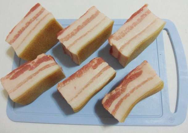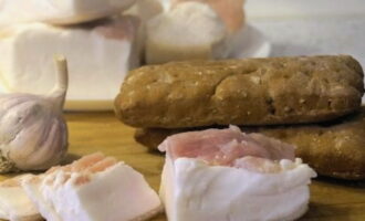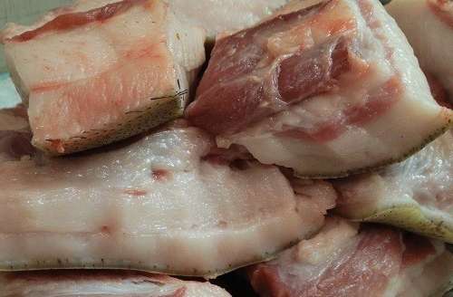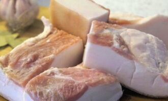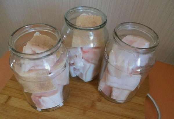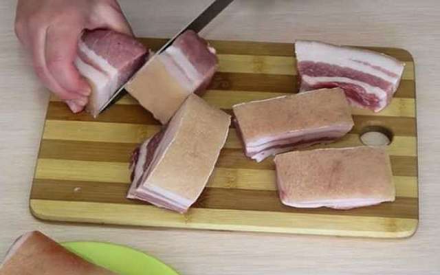 - Laten we vers reuzel bereiden om te zouten. We gieten het over met koud water en vegen het grondig af. Vervolgens snijden we het product in kleine stukjes die gemakkelijk door de hals van een glazen pot kunnen kruipen.