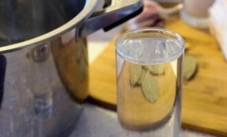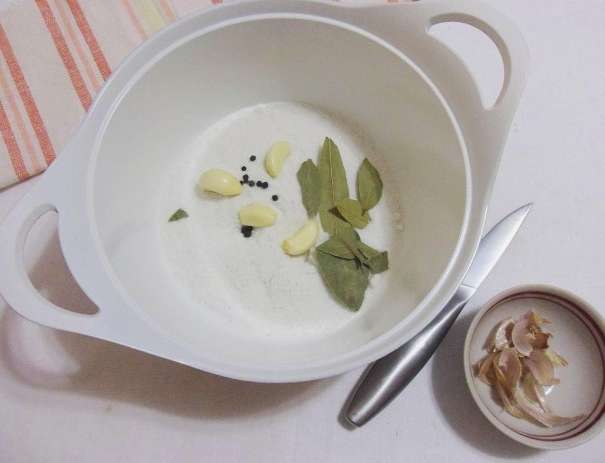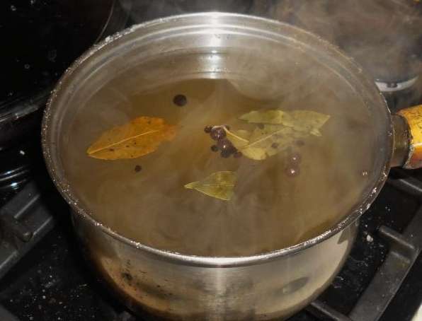 - Laten we vervolgens de pekel voorbereiden. Kook hiervoor water met zout, peper en laurierblaadjes in een grote pan.