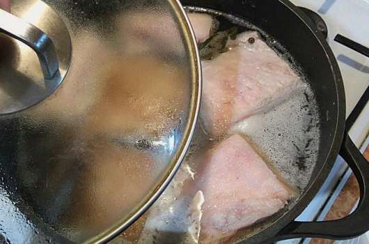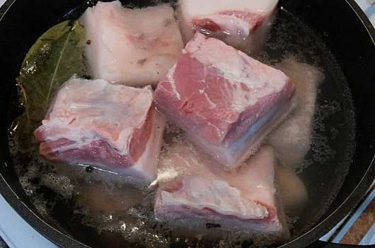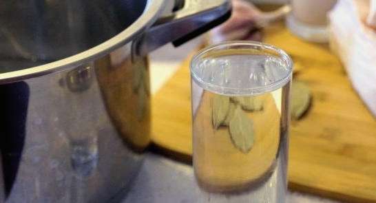 - Giet water in een diepe pan, voeg zout, peper en laurierblaadjes toe. Ook dopen we stukjes spek in zo'n pekel.