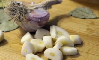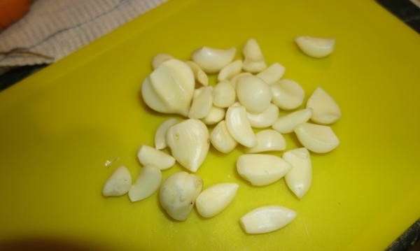 Laten we op dit moment voor de knoflook zorgen. Het moet worden geschild en in kleine stukjes worden gesneden.