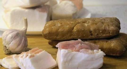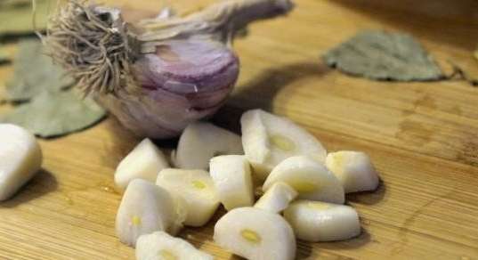 - We maken de knoflook van de schil schoon en verspreiden de kruidnagels naar de stukjes spek. Vul het voedsel tot aan de hals met hete pekel. We sluiten hem af met een ijzeren deksel, koelen hem een dag en zetten hem dan 6 dagen in de koelkast.