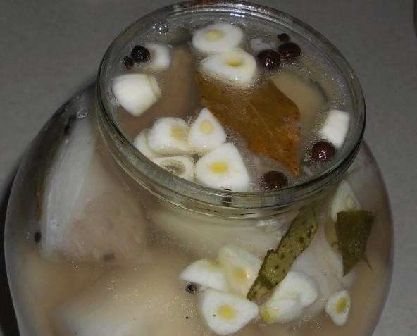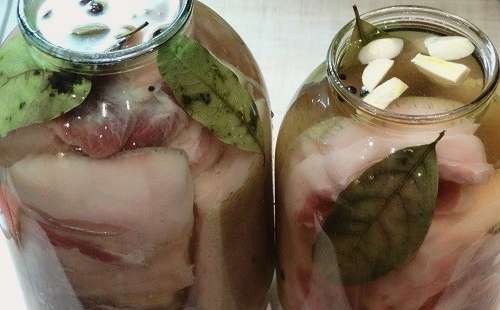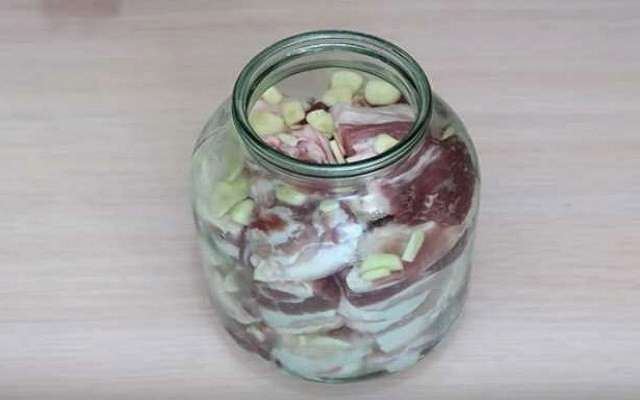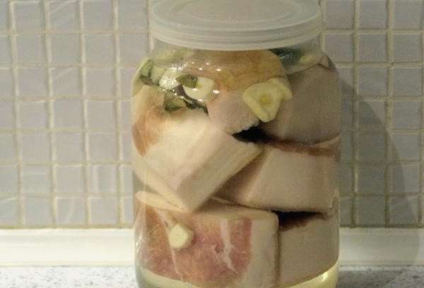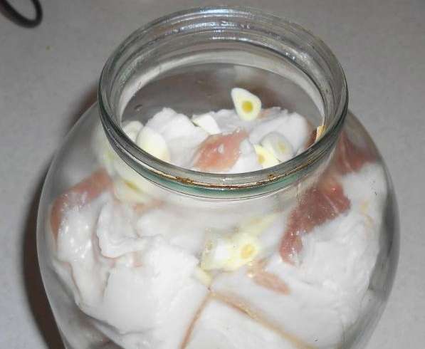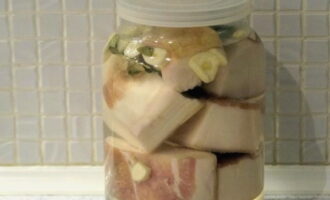 - We doen stukjes spek in schone glazen potten. Vul ze met koude pekel en voeg knoflook toe. We verplaatsen het product 5 dagen naar de koelkast.