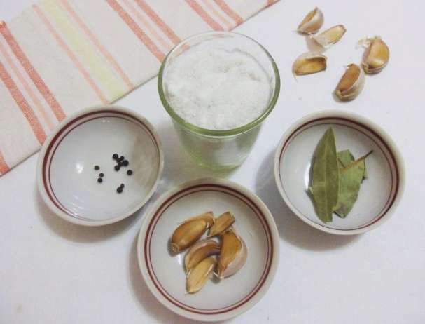 - Laten we eerst de pekel voorbereiden. Om dit te doen, kook water met zout en kruiden (behalve knoflook) gedurende 10-15 minuten. Haal van het vuur en laat afkoelen tot kamertemperatuur.