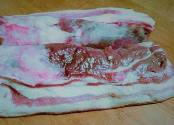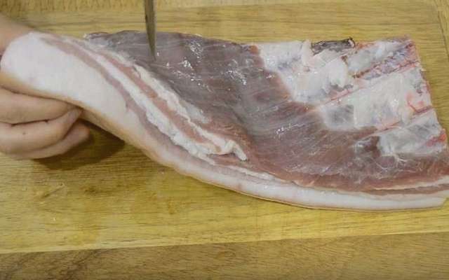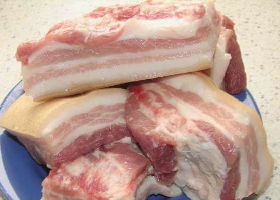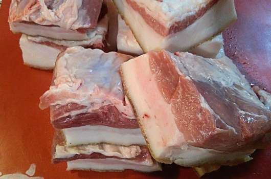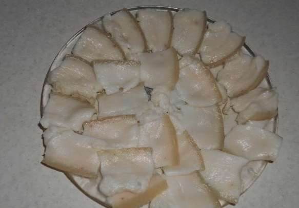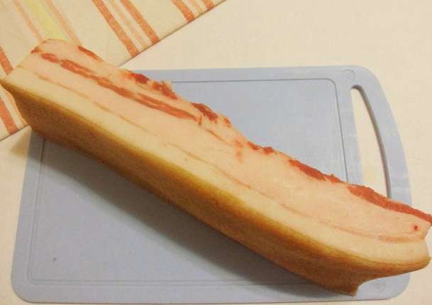 - We halen het afgewerkte spek uit de pot met pekel, bevriezen het in de vriezer, snijden het en serveren het op tafel.