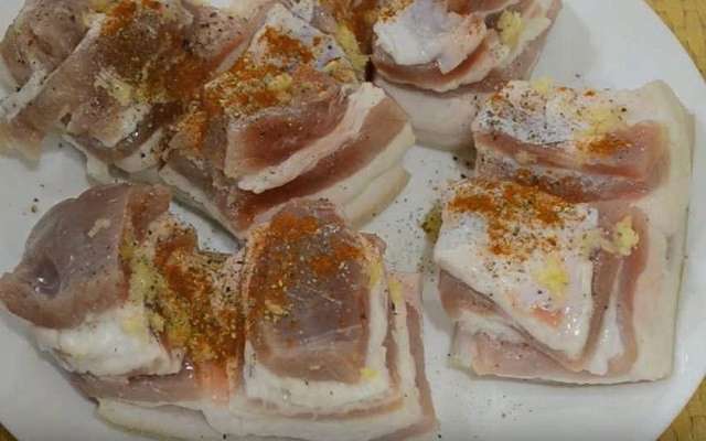 - Wrijf elk stuk spek grondig in met paprikapoeder en gemalen peper, evenals gehakte teentjes knoflook. We doen het product in een schone gebroeid pot.