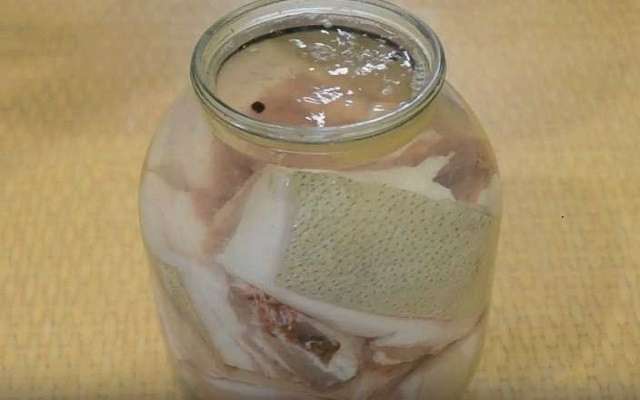 - Doe de stukjes spek in een schone glazen pot. Vul het product met hete pekel. We sluiten het deksel, koelen volledig af en zetten een dag in de koelkast.