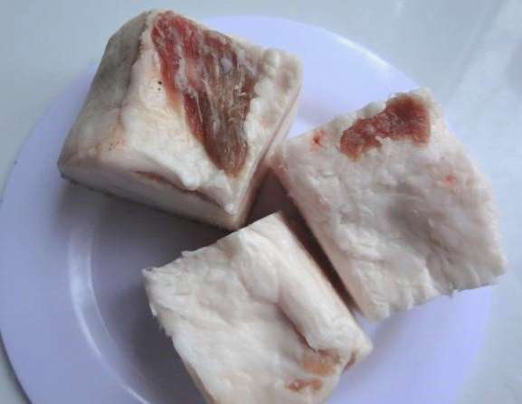 - Voor het "damesrecept" kiezen we voor verse reuzel met vlees. We wassen het, vegen het af en snijden het in kleine stukjes.