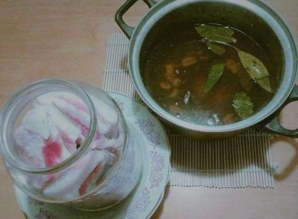 - Vul het spek met hete pekel tot de top, draai het vast met een ijzeren deksel en laat het een dag staan, waarna we het nog 6 dagen naar de koelkast verplaatsen.