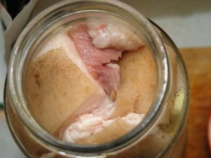 - Doe de stukjes spek op dit moment in een schone en droge pot. Vul het product met geurige en gekleurde pekel.