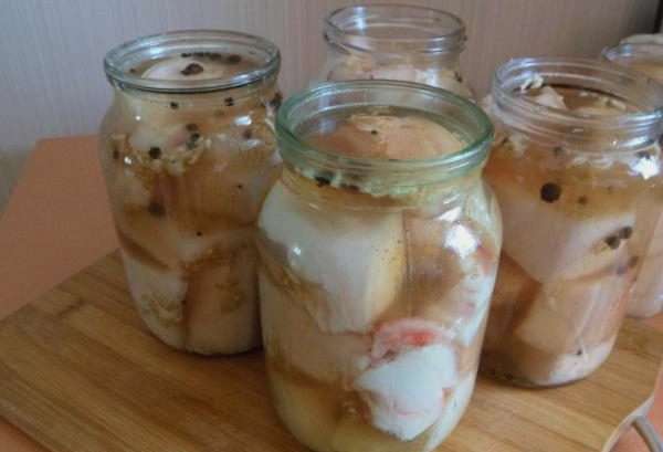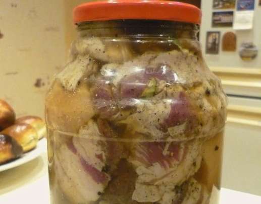 - Zelfgemaakt reuzel in pekel, opgerold onder een ijzeren deksel voor de winter