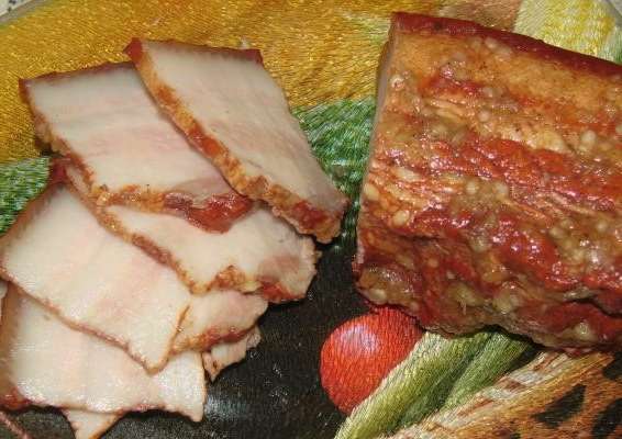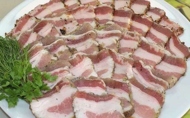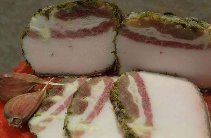 - Wanneer het spek volledig is afgekoeld en verzadigd met kruiden, kan het uit de pot worden gehaald en geserveerd. Voor beter snijden kan het product korte tijd naar de vriezer worden gestuurd.