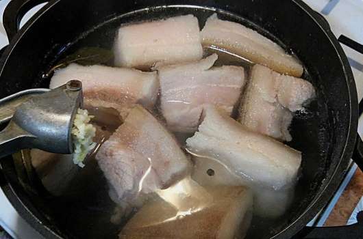 Zachte reuzel in hete pekel met knoflook