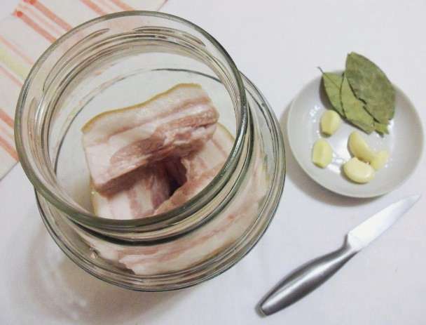 Doe de stukjes spek stevig in schone en droge potten, afgewisseld met knoflook, laurierblaadjes en zwarte peperkorrels. Vul met kokend water, sluit het deksel en laat afkoelen.