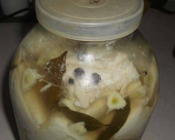 - Vul het product met pekel. We persen hier ook gepelde knoflook. We laten de lege plekken een paar uur staan en leggen ze vervolgens 6-7 dagen in de koelkast.