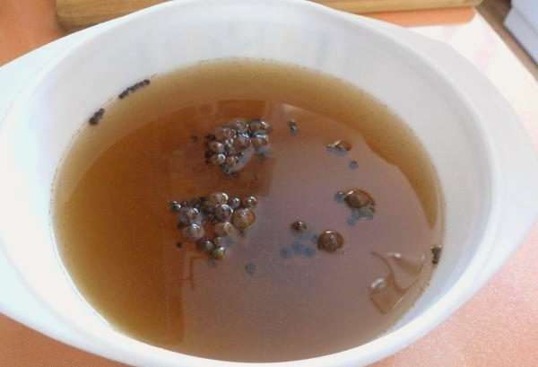 - Laten we meteen beginnen met het bereiden van de pekel. Kook water met zout en zwarte peperkorrels in een pan.