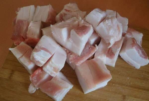 - Op dit moment keren we terug naar het varkensvleesproduct. Reuzel met lagen moet in kleine stukjes worden verdeeld, die we onmiddellijk in een schone en gebroeid pot doen.