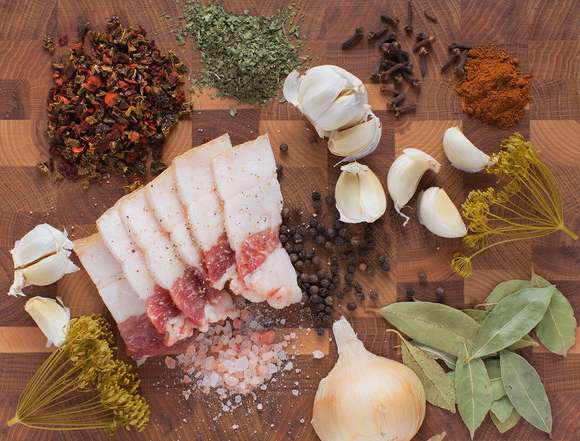 - Na het zouten worden de stukjes spek uit de pekel gehaald en aangevuld met je favoriete kruiden. Bestrooi bijvoorbeeld de helft van het product met paprikapoeder.