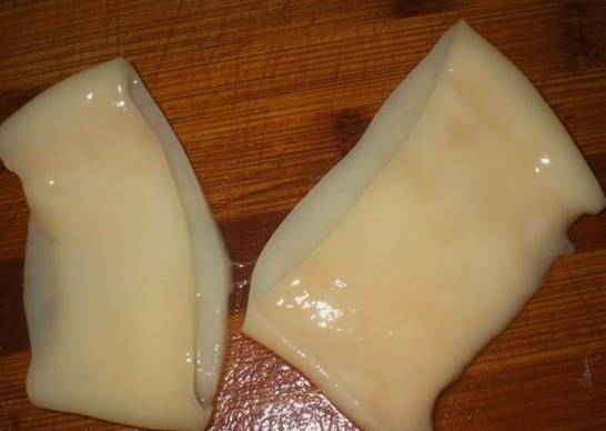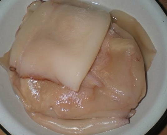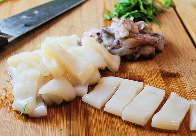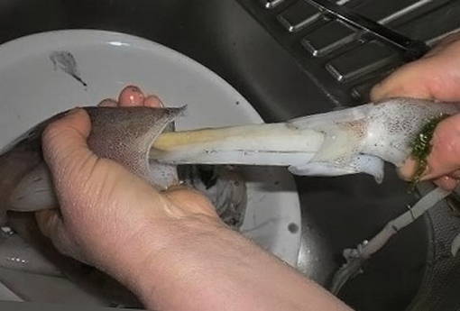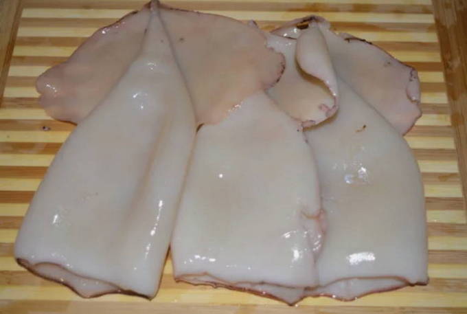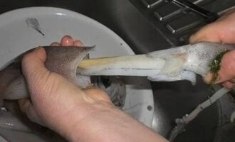 - Was op dit moment de inktvis en maak ze van de binnenkant schoon. Verwijder de film die het lichaam van de inktvis bedekt.Om dit heel gemakkelijk te doen, giet je kokend water in een kom en dompel je de zeevruchten er een paar minuten in. De huid zal heel gemakkelijk loslaten.
