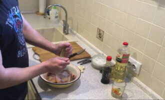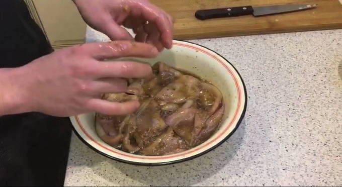 - Snijd de karkassen in brede ringen. Doe in een kom en bedek met marinade. Roer met je handen en verdeel de vloeistof en kruiden gelijkmatig over de stukjes. Laat 30 minuten marineren op kamertemperatuur.