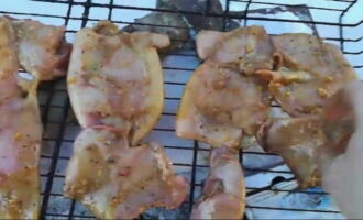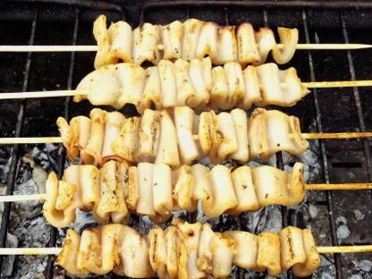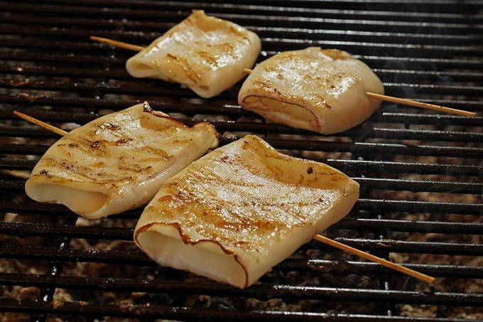 - Steek de grill aan en kook hete kolen. Leg de zeevruchten op een rooster en kook ze 2-3 minuten aan elke kant op hoog vuur. Breng de inktvis tijdens het koken op smaak met de resterende marinade. Zodra de stukjes bruin zijn, haal je ze van de grill.
