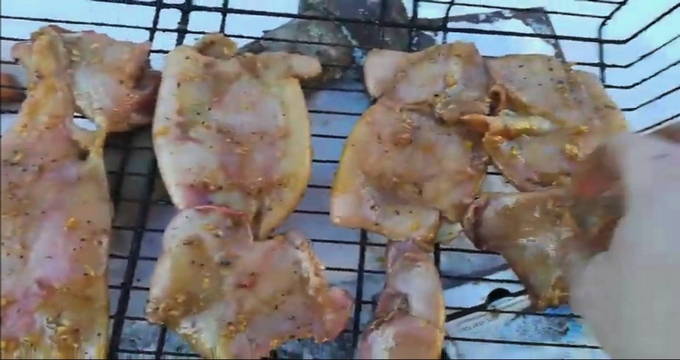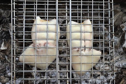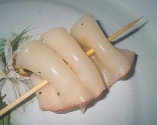 - Hak de kokkels grof en wrijf de plakjes in met zout en gemalen witte peper. Leg de inktvis op houten spiesen. Om dit gemakkelijker te maken, bevochtigt u de stukken hout licht met water.