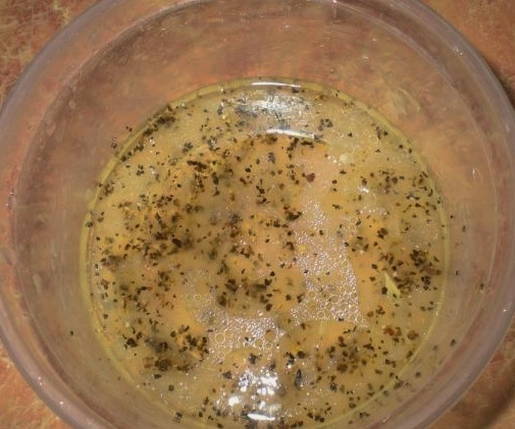 - Begin met het maken van de marinade. Giet citroensap in een diepe kom. Je kunt citroendressing gebruiken of vers citroensap persen. Voeg plantaardige olie toe en roer onmiddellijk. Olijf is het lekkerst, het geeft smaak aan de marinade. Voeg zwarte en witte gemalen peper, Provençaalse kruiden toe. Roer en laat trekken.