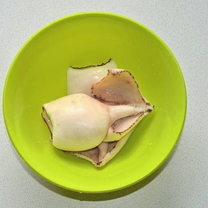 Bereid de inktvis voor. Giet er kokend water over, verwijder de film. Schil de binnenkant van de inktvis, spoel af en doe in een kom.