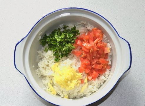 - Was en droog de tomaten en peterselie. Snijd de tomaten in kleine blokjes. Hak de helft van het bosje groen fijn. Schil de gemberwortel en rasp deze op een fijne rasp. Voeg gehakte ingrediënten toe aan gekookte rijst. Roeren. Peper en besprenkel met het sap van een halve citroen. Roer de vulling nogmaals goed door.