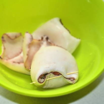 - Vul de voorbereide inktvis en voeg de randen samen met een tandenstoker zodat de vulling er niet uit valt.