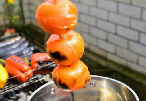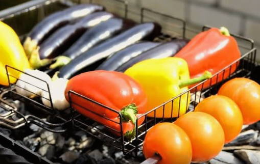 - Leg alle groenten, behalve tomaten, op een rooster, ingevet met plantaardige olie. Leg de tomaten op een spies. Niet snijden, heel bakken. Om groenten te koken, heb je een lager vuur nodig, zodat ze gelijkmatig garen. Kook ze daarom na zeevruchten. Draai het rooster en de spies regelmatig om.
